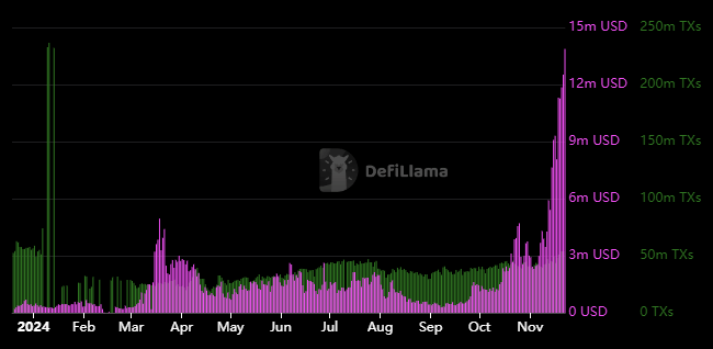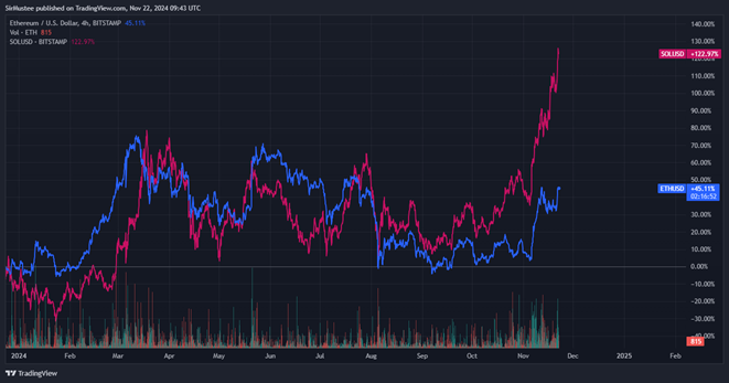 Ethereum increased 40% from $2,375 to $3,445 between November 5 and November 22, with a market cap of $407.18 billion. Meanwhile, Solana increased more than 70% from $154 to an all-time high of $265, with a market cap of $123.32 billion.