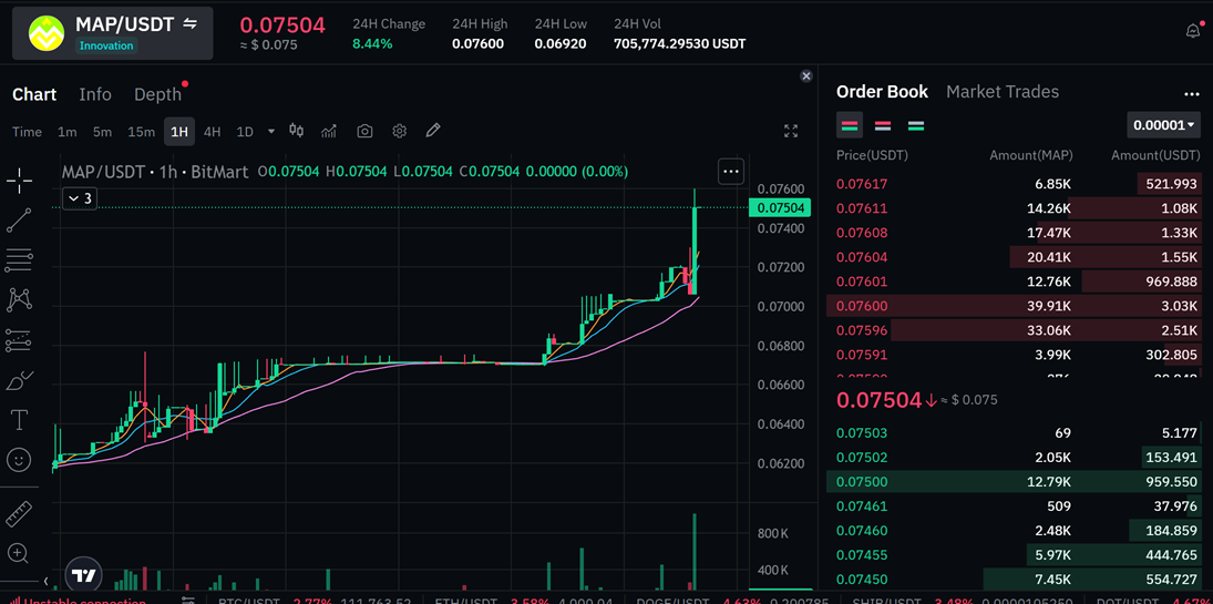 The crypto market is more exciting than ever as MAP/USDT continues to make a remarkable milestone, rising sharply to 0.079 USDT, recording an increase of more than 10% in just 24 hours. This is a signal that the bullish momentum is being strongly activated, as global investors start to return with firm confidence in the MapNode ecosystem.