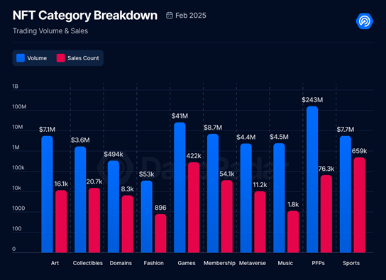 Profile picture and gaming NFTs recorded the largest trading volumes for individual NFT categories in February. Source: DappRadar