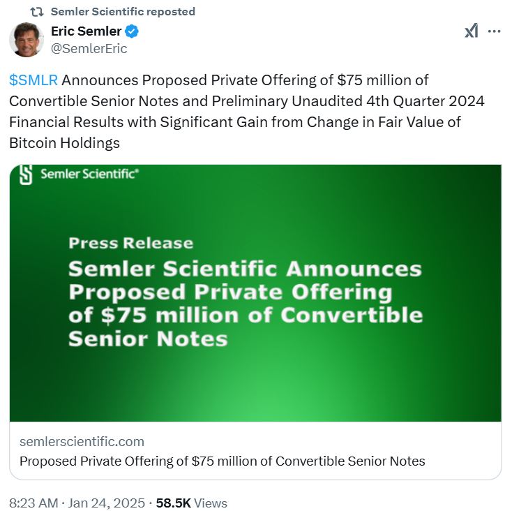 Semler Scientific is planning to raise $75 million through a private offering of convertible senior notes, which will help fund further Bitcoin purchases.