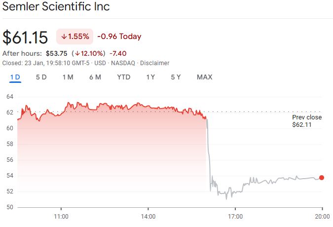 Shares in Semler (SMLR) closed 1.55% down on Jan. 23 and continued to fall over 12% in after-hours trading to $53.75, according to Google Finance.